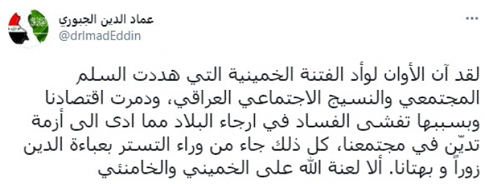 وقال في تغريدة عبر "تويتر" رصدها "المشهد العربي": "لقد آن الأوان لوأد الفتنة الخمينية التي هددت السلم المجتمعي والنسيج الاجتماعي العراقي، ودمرت اقتصادنا وبسببها تفشى الفساد في ارجاء البلاد مما ادى الى أزمة تديّن في مجتمعنا، كل ذلك جاء من وراء التستر بعباءة الدين زوراً و بهتانا. ألا .... الله على الخميني والخامنئي".