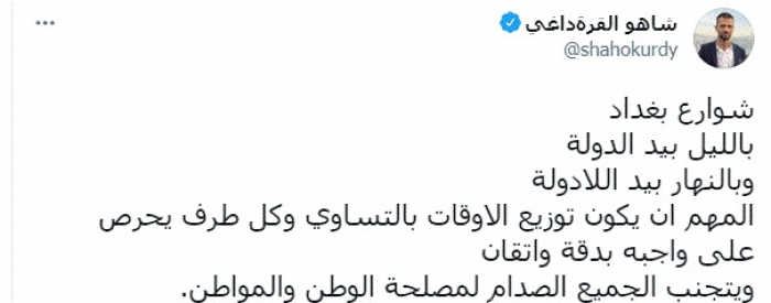 وقال في تغريدة عبر "تويتر" رصدها "المشهد العربي": "شوارع بغداد بالليل بيد الدولة وبالنهار بيد اللادولة المهم أن يكون توزيع الأوقات بالتساوي وكل طرف يحرص على واجبه بدقة وإتقان ويتجنب الجميع الصدام لمصلحة الوطن والمواطن".