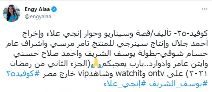 روجت الكاتبة إنجي علاء لمسلسلها الجديد "كوفيد-25"، المقرر عرضه في الموسم الرمضاني المقبل، من خلال حسابها بموقع "تويتر".