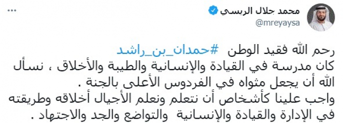وكتب في تغريدة عبر "تويتر" رصدها "المشهد العربي": "رحم الله فقيد الوطن حمدان بن راشد كان مدرسة في القيادة والإنسانية والطيبة والأخلاق، نسأل الله أن يجعل مثواه في الفردوس الأعلى بالجنة.. واجب علينا كأشخاص أن نتعلم ونعلم الأجيال أخلاقه وطريقته في الإدارة والقيادة والإنسانية والتواضع والجد والاجتهاد".