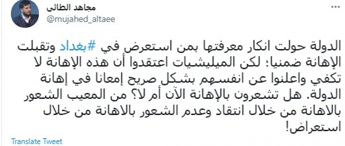 وقال في تغريدة عبر "تويتر" رصدها "المشهد العربي": "الدولة حولت انكار معرفتها بمن استعرض في بغداد وتقبلت الإهانة ضمنيا؛ لكن الميليشيات اعتقدوا أن هذه الإهانة لا تكفي وأعلنوا عن أنفسهم بشكل صريح إمعانا في إهانة الدولة. هل تشعرون بالإهانة الآن أم لا؟ من المعيب الشعور بالإهانة من خلال انتقاد وعدم الشعور بالإهانة من خلال استعراض".