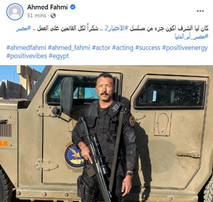 ونشر "فهمي"، صورة له من كواليس العمل عبر حسابه بموقع "تويتر"، وعلق: "كان ليا الشرف أكون جزءًا من مسلسل الاختيار 2، شكرًا لكل القائمين على العمل، مصر أم الدنيا".