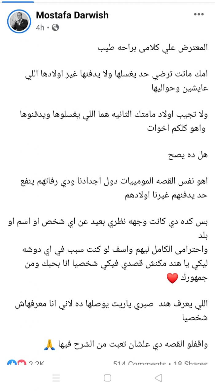 وكتب درويش، عبر حسابه بموقع "فيسبوك": "المعترض على كلامي براحة طيب.. أمك ماتت ترضى حد يغسلها ولا يدفنها غير أولادها اللي عايشين وحواليها، ولا تجيب أولاد مامتك الثانية هما اللي يغسلوها ويدفنوها وأهو كلكم أخوات، هل ده يصح؟".