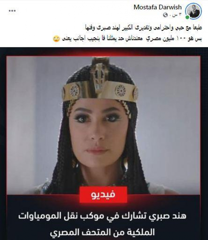 وفي منشور آخر، رد الفنان مصطفى درويش، عن انتقاد البعض له بسبب رفضه مشاركة الفنانة التونسية هند صبري في موكب نقل المومياوات الملكية من المتحف المصري لمتحف الحضارة.