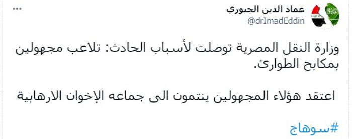 وقال في تغريدة عبر "تويتر" رصدها "المشهد العربي": "وزارة النقل المصرية توصلت لأسباب الحادث: تلاعب مجهولين بمكابح الطوارئ. اعتقد هؤلاء المجهولين ينتمون الى جماعه الإخوان الارهابية".