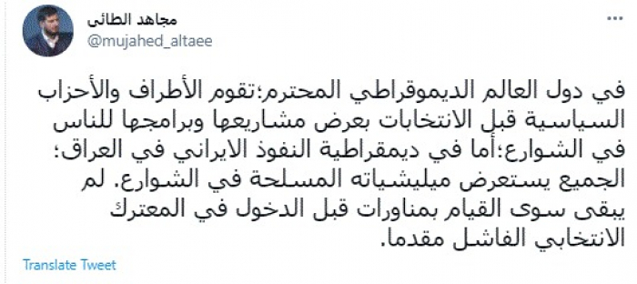 وقال في تغريدة عبر "تويتر" رصدها "المشهد العربي": "في دول العالم الديموقراطي المحترم؛تقوم الأطراف والأحزاب السياسية قبل الانتخابات بعرض مشاريعها وبرامجها للناس في الشوارع؛ أما في ديمقراطية النفوذ الإيراني في العراق؛الجميع يستعرض ميليشياته المسلحة في الشوارع. لم يبقى سوى القيام بمناورات قبل الدخول في المعترك الانتخابي الفاشل مقدمًا".
