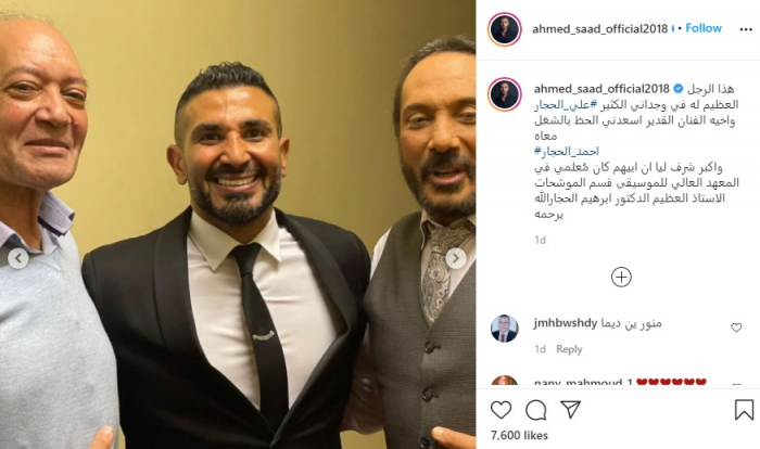 وعلق "سعد"، عبر حسابه بموقع "إنستجرام": "هذا الرجل العظيم له في وجداني الكثير، علي الحجار وأخوه الفنان القدير الذي أسعدني الحظ بالشغل معه، أحمد الحجار، وأكبر شرف لي أن أباهما كان المدرس بتاعي في المعهد العالي للموسيقى قسم الموشحات، الأستاذ العظيم الدكتور إبراهيم الحجار".