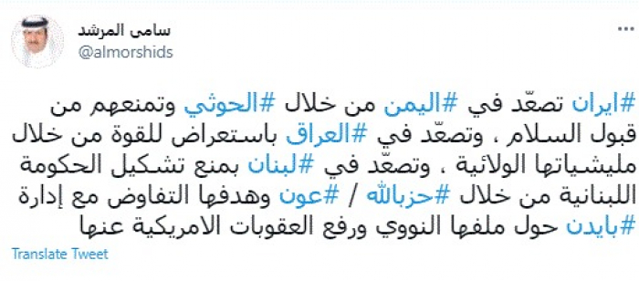 وقال في تغريدة عبر "تويتر" رصدها "المشهد العربي": "إيران تصعّد في اليمن من خلال الحوثي وتمنعهم من قبول السلام ، وتصعّد في العراق باستعراض للقوة من خلال مليشياتها الولائية، وتصعّد في لبنان بمنع تشكيل الحكومة اللبنانية من خلال حزب الله عون وهدفها التفاوض مع إدارة بايدن حول ملفها النووي ورفع العقوبات الأمريكية عنها".