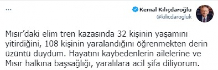 عبر رئيس حزب الشعب الجمهوري التركي المعارض، كمال كليتشدار أوغلو، عن مواساته لذوي ضحايا حادث القطار في مصر.