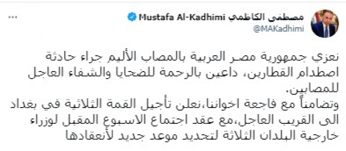 وجه رئيس وزراء العراق مصطفى الكاظمي، تعازيه إلى مصر في ضحايا حادث تصادم قطارين خلف العشرات من المصابين، معلنا تأجيل القمة الثلاثية.