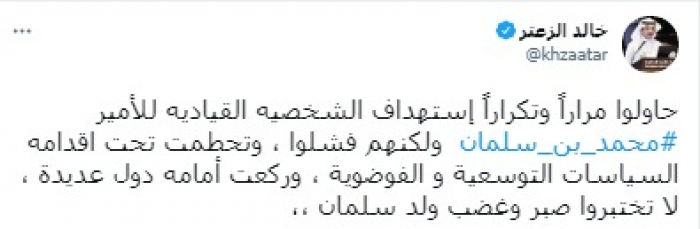 وتابع: "تحطمت تحت أقدامه السياسات التوسعية والفوضوية، وركعت أمامه دول عديدة، لا تختبروا صبر وغضب ولد سلمان".