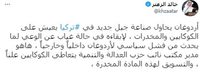 ولفت في تغريدة على حسابه بموقع التدوين المصغر تويتر، اليوم إلى أن: "أردوغان يحاول صناعة جيل جديد في تركيا يعيش على الكوكايين والمخدرات، لإبقاءه في حالة غياب عن الوعي لما يحدث من فشل سياسي لأردوغان داخلياً وخارجياً".