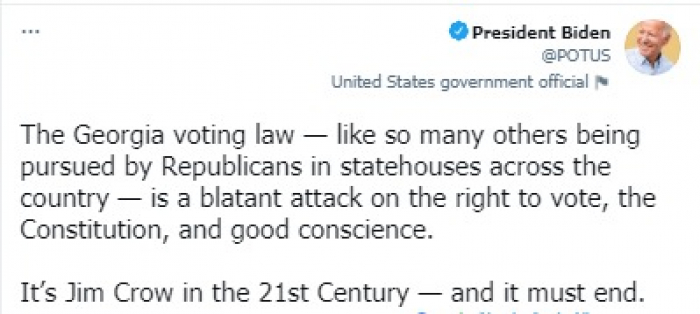وقال في تغريدة على حسابه بموقع التدوين المصغر تويتر، اليوم إن: "قانون التصويت في جورجيا - مثل العديد من القوانين الأخرى التي يتبعها الجمهوريون في دور الولاية في جميع أنحاء البلاد - هو هجوم صارخ على الحق في التصويت والدستور والضمير السليم".