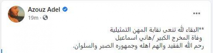وكتب عادل: "البقاء لله.. تنعى نقابة المهن التمثيلية وفاة المخرج الكبير هاني إسماعيل، رحم الله الفقيد وألهم أهله وجمهوره الصبر والسلوان".