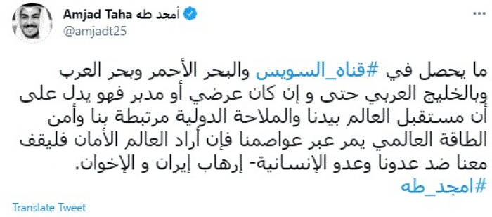 وكتب في تغريدة عبر "تويتر" رصدها "المشهد العربي": "ما يحصل في قناة السويس والبحر الأحمر وبحر العرب وبالخليج العربي حتى وإن كان عرضي أو مدبر فهو يدل على أن مستقبل العالم بيدنا والملاحة الدولية مرتبطة بنا وأمن الطاقة العالمي يمر عبر عواصمنا فإن أراد العالم الأمان فليقف معنا ضد عدونا وعدو الإنسانية- إرهاب إيران و الإخوان".