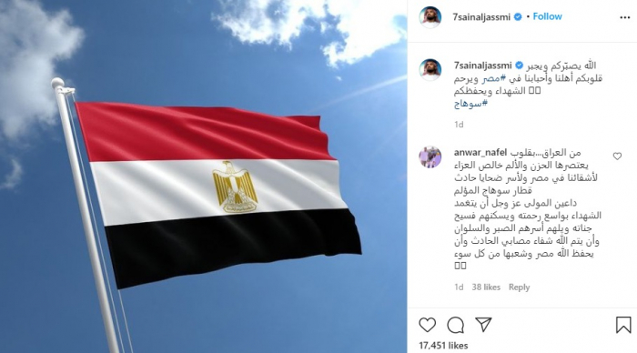ونشر الجسمي، علم مصر، عبر حسابه على إنستجرام، وعلق: "الله يصبّركم ويجبر قلوبكم أهلنا وأحبابنا في مصر، ويرحم الشهداء ويحفظكم.. سوهاج".