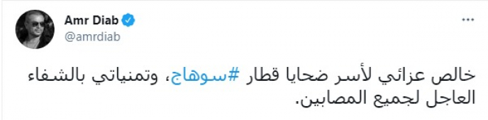 نعى الفنان عمرو دياب، ضحايا حادث تصادم قطارين بقرية الصوامعة غرب بمدينة طهطا بمحافظة سوهاج في مصر، والذي أدى إلى سقوط إصابات ووفيات.