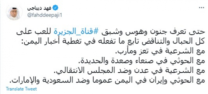 وجه المحلل السياسي السعودي فهد ديباجي، انتقادًا لاذعًا لقناة الجزيرة القطرية، جراء تناقضها في تغطية أخبار اليمن.