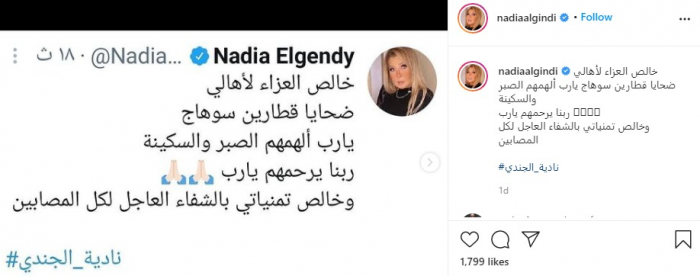 وكتبت نادية، عبر حسابها على "إنستجرام": "خالص العزاء لأهالي ضحايا قطارين سوهاج يا رب ألهمهم الصبر والسكينة، ربنا يرحمهم يا رب، وخالص تمنياتي بالشفاء العاجل لكل المصابين".
