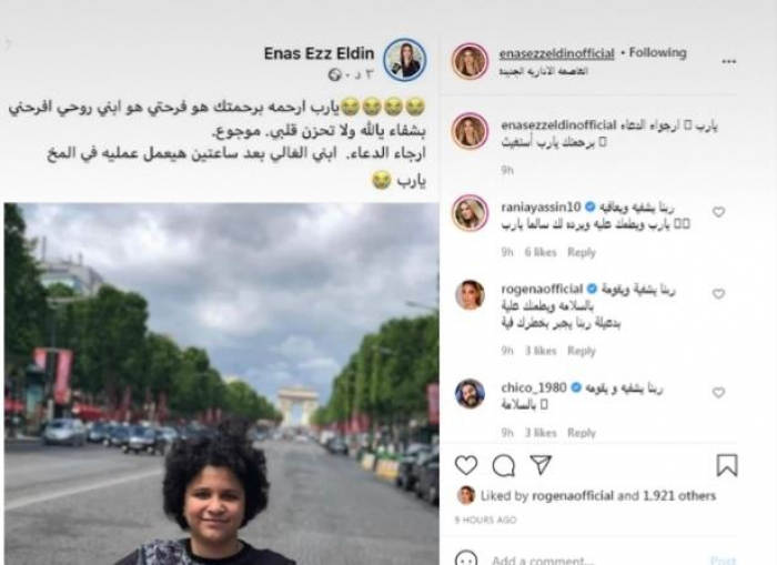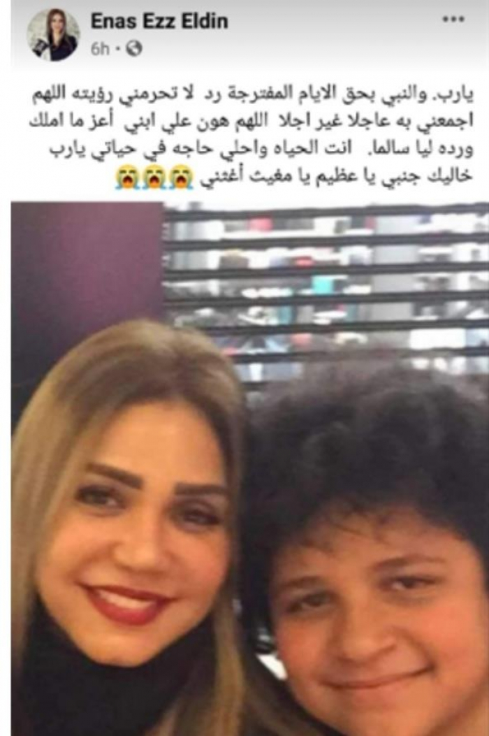 ونشرت إيناس، صورة لها معه عبر حسابها على إنستجرام ، وكتبت:"يا رب ارحمه برحمتك.. هو فرحتي، هو ابني روحي.. افرحني بشفاءه يا الله ولا تحزن قلبي، أرجو الدعاء لابني الغالي هيعمل عملية في المخ".