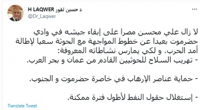 وقال في تغريدة عبر "تويتر" رصدها "المشهد العربي": "لا زال علي محسن مصرًا على إبقاء جيشه في وادي حضرموت بعيدًا عن خطوط المواجهة مع الحوثة سعيًا لإطالة أمد الحرب، و لكي يمارس نشاطاته المعروفة".