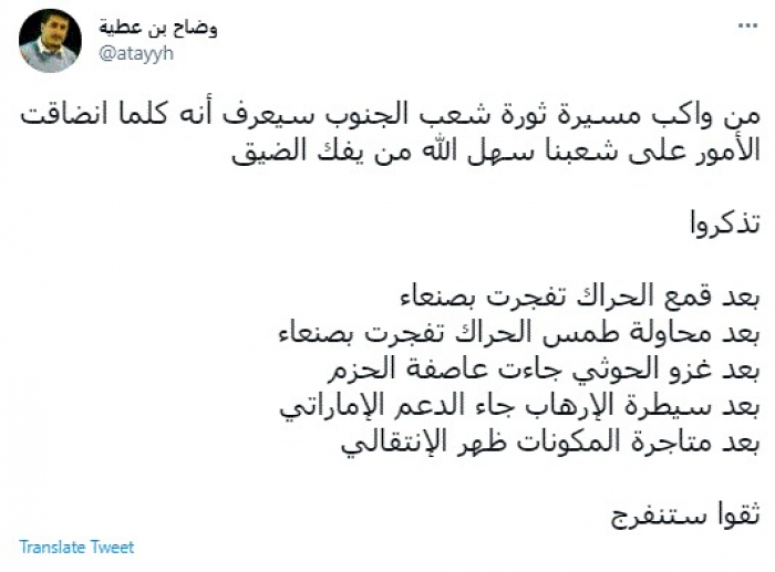 وقال في تغريدة عبر "تويتر" رصدها "المشهد العربي": "من واكب مسيرة ثورة شعب الجنوب سيعرف أنه كلما انضاقت الأمور على شعبنا سهل الله من يفك الضيق".