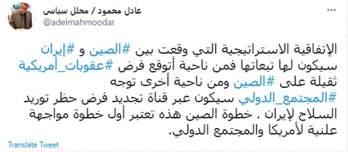 وقال في تغريدة عبر "تويتر" رصدها "المشهد العربي": "الإتفاقية الاستراتيجية التي وقعت بين الصين وإيران سيكون لها تبعاتها فمن ناحية أتوقع فرض عقوبات أمريكية ثقيلة على الصين ومن ناحية أخرى توجه المجتمع الدولي سيكون عبر قناة تجديد فرض حظر توريد السلاح لإيران . خطوة الصين هذه تعتبر أول خطوة مواجهة علنية لأمريكا والمجتمع الدولي".