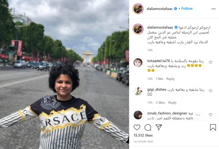 ونشرت داليا صورة نجل إيناس عز الدين عبر حسابها على إنستجرام، وعلقت: "أرجوكم، أرجوكم.. ادعوا لحبيبي ابن الزميلة إيناس عز الدين بيعمل عمليه في المخ الآن.. الدعاء يرد القدر، يا رب اشفيه وعافيه يارب".