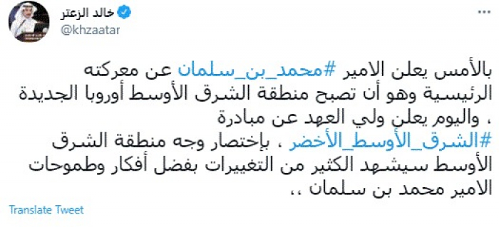 وكتب في تغريدة عبر "تويتر" رصدها "المشهد العربي": "بالأمس يعلن الأمير محمد بن سلمان عن معركته الرئيسية وهو أن تصبح منطقة الشرق الأوسط أوروبا الجديدة، واليوم يعلن ولي العهد عن مبادرة الشرق الأوسط الأخضر، بإختصار وجه منطقة الشرق الأوسط سيشهد الكثير من التغييرات بفضل أفكار وطموحات الامير محمد بن سلمان".