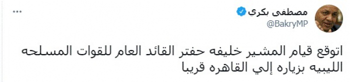وقال في تغريدة عبر "تويتر" رصدها "المشهد العربي": "اتوقع قيام المشير خليفة حفتر القائد العام للقوات المسلحة الليبية بزيارة إلي القاهرة قريبا".