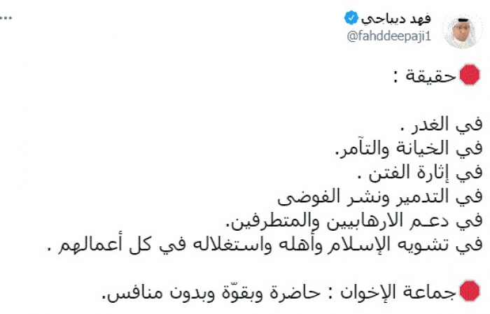 وقال في تغريدة عبر "تويتر" رصدها "المشهد العربي": "حقيقة: في الغدر.. في الخيانة والتآمر.. في إثارة الفتن.. في التدمير ونشر الفوضى.. في دعـم الارهابيين والمتطرفين.. في تشويه الإسلام وأهله واستغلاله في كل أعمالهم.. جماعة الإخوان : حاضرة وبقوّة وبدون منافس".
