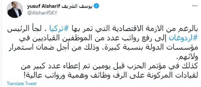 وقال في تغريدة عبر "تويتر" رصدها "المشهد العربي": "بالرغم من الازمة الاقتصادية التي تمر بها تركيا ، لجأ الرئيس أردوغان إلى رفع رواتب عدد من الموظفين القياديين في مؤسسات الدولة بنسبة كبيرة، وذلك من أجل ضمان استمرار ولائهم. كذلك في مؤتمر الحزب قبل يومين تم إعطاء عدد كبير من لقيادات المركونة على الرف وظائف وهمية ورواتب عالية".