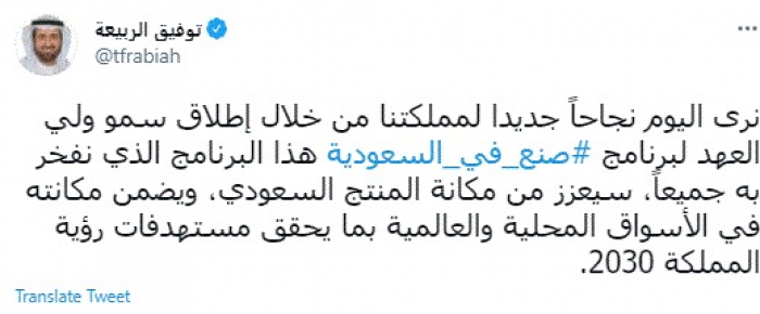وقال في تغريدة عبر "تويتر" رصدها "المشهد العربي": "نرى اليوم نجاحاً جديدا لمملكتنا من خلال إطلاق سمو ولي العهد لبرنامج صنع في السعودية هذا البرنامج الذي نفخر به جميعاً، سيعزز من مكانة المنتج السعودي، ويضمن مكانته في الأسواق المحلية والعالمية بما يحقق مستهدفات رؤية المملكة 2030".