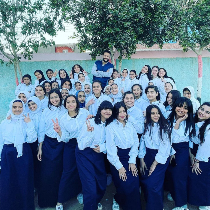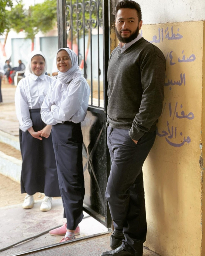 ظهر "هلال" في الصورة رفقة مجموعة من الفتيات ضمن أحداث المسلسل، وعلق: "المدرس الفرفوش رزق، وأجمل طلبة ثانوي مسلسل المداح، رمضان 2021".