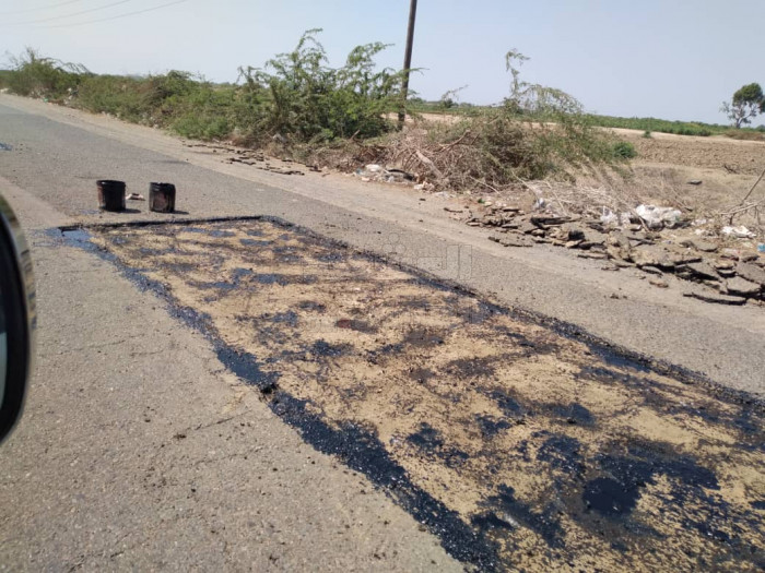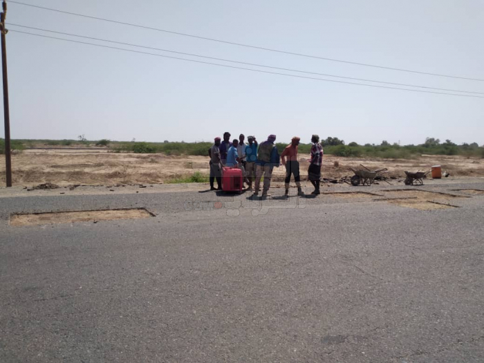 وشرع شباب في نثر الدهان الأسود على مواقع الحفر قبل صب الأسفلت عليها بماكينة (الدكاكة).