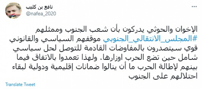 وكتب في تغريدة عبر "تويتر" رصدها "المشهد العربي": "الإخوان والحوثي يدركون بأن شعب الجنوب وممثلهم المجلس الانتقالي الجنوبي موقفهم السياسي والقانوني قوي سيتصدرون بالمفاوضات القادمة للتوصل لحل سياسي شامل حين تضع الحرب أوزارها".