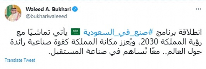 وكتب في تغريدة عبر "تويتر" رصدها "المشهد العربي": "انطلاقة برنامج صنع في السعودية يأتي تماشيًا مع رؤية المملكة 2030، ويُعزز مكانة المملكة كقوة صناعية رائدة حول العالم.. معًا نُساهم في صناعة المستقبل".