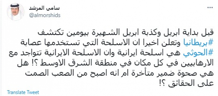وقال في تغريدة عبر "تويتر" رصدها "المشهد العربي": "قبل بداية إبريل وكذبة إبريل الشهيرة بيومين تكتشف بريطانيا وتعلن أخيرًا أن الأسلحة التي تستخدمها عصابة الحوثي هي أسلحة إيرانية وأن الأسلحة الإيرانية تتواجد مع الإرهابيين في كل مكان في منطقة الشرق الأوسط ؟."