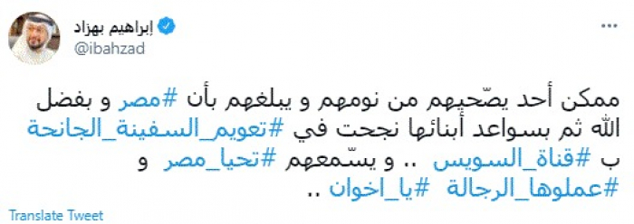 وقال في تغريدة عبر "تويتر" رصدها "المشهد العربي": "ممكن أحد يصّحيهم من نومهم و يبلغهم بأن مصر وبفضل الله ثم بسواعد أبناءها نجحت في تعويم السفينة الجانحة بقناة السويس .. ويسّمعهم تحيا مصر وعملوها الرجالة يا إخوان".
