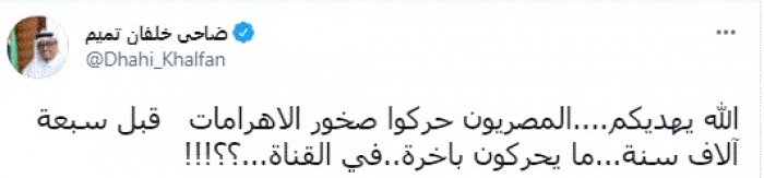 وقال في تغريدة عبر "تويتر" رصدها "المشهد العربي": "الله يهديكم... .المصريون حركوا صخور الأهرامات قبل سبعة آلاف سنة... ما يحركون باخرة.. في القناة".