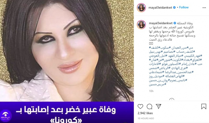 ونعت الإعلامية الكويتية مي العيدان، عبير الخضر عبر حسابها على "إنستجرام"، قائلة: "وفاة الممثلة الكويتية عبير الخضر بعد إصابتها بفيروس كورونا".