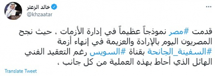 وكتب في تغريدة عبر "تويتر" رصدها "المشهد العربي": "قدمت مصر نموذجاً عظيماً في إدارة الأزمات ، حيث نجح المصريون اليوم بالإرادة والعزيمة في إنهاء أزمة السفينة الجانحة بقناة السويس رغم التعقيد الفني الهائل الذي أحاط بهذه العملية من كل جانب".