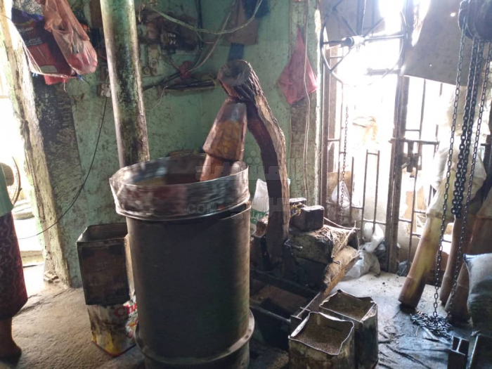 تصنع معصرة زيت السمسم التقليدية من جذوع الأشجار الكبيرة على شكل دائري مجوف من الداخل وترتبط بعود من داخلها، لطحن حبات السمسم، لاستخلاص الزيت المستخدم في العديد من الصناعات.