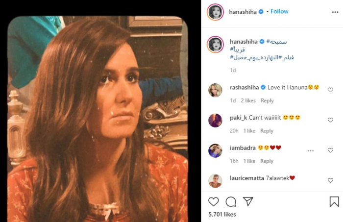 ونشرت هنا، صورة لشخصيتها بالفيلم، عبر حسابها على إنستجرام، وعلقت: "سميحة..قريبًا.. فيلم (النهاردة يوم جديد)".