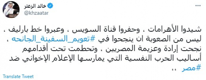 وكتب في تغريدة عبر "تويتر" رصدها "المشهد العربي": "شيدوا الأهرامات، وحفروا قناة السويس، وعبروا خط بارليف، ليس من الصعوبة أن ينجحوا في تعويم السفينة الجانحة، نجحت إرادة وعزيمة المصريين، وتحطمت تحت أقدامهم أساليب الحرب النفسية التي يمارسها الإعلام الإخواني ضد مصر".