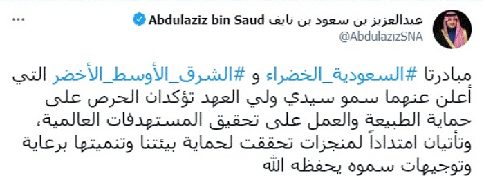 أشاد وزير الداخلية السعودي الأمير عبد العزيز بن سعود بن نايف، اليوم، بالمبادرات التي أعلن عنها ولي العهد السعودي الأمير محمد بن سلمان، مشددًا على أن تلك المبادرة تؤكد الحرص على حماية الطبيعة والعمل على تحقيق المستهدفات العالمية.