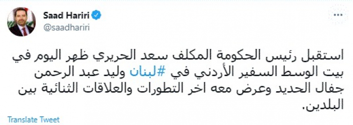 وقال في تغريدة عبر "تويتر" رصدها "المشهد العربي": "استقبل رئيس الحكومة المكلف سعد الحريري ظهر اليوم في بيت الوسط السفير الأردني في لبنان وليد عبد الرحمن جفال الحديد وعرض معه آخر التطورات والعلاقات الثنائية بين البلدين".
