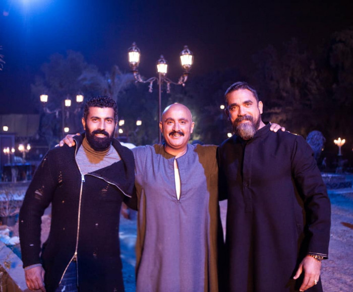 وظهر"سامي" في الصورة رفقة الفنان أحمد السقا، أمير كرارة، علق : "مسلسل نسل الأغراب".