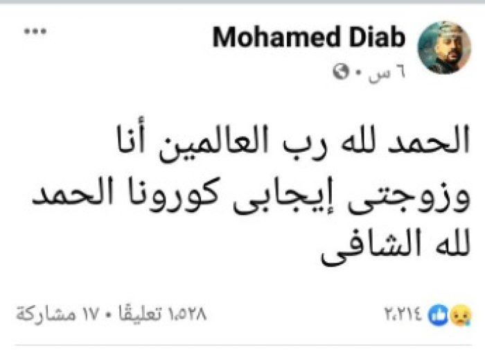 دياب كشف عن الإصابة عبر صفحته بموقع فيسبوك، وكتب:"الحمد لله رب العالمين أنا وزوجتي إيجابى كورونا، الحمد لله الشافي".