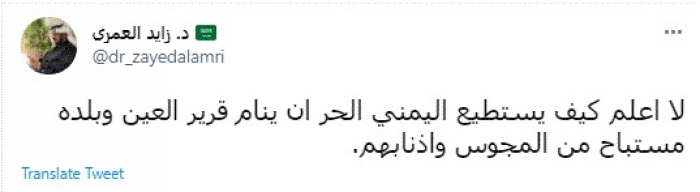 وقال في تغريدة عبر "تويتر" رصدها "المشهد العربي": "لا أعلم كيف يستطيع اليمني الحر أن ينام قرير العين وبلده مستباح من المجوس وأذنابهم".